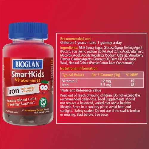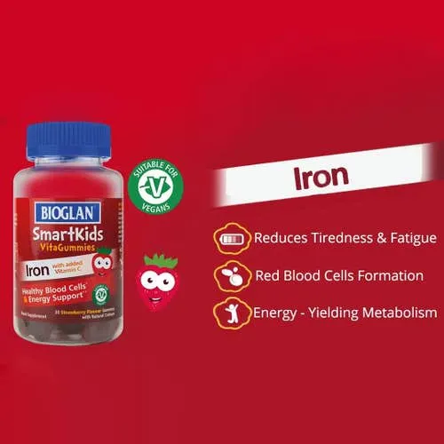- Bioglan SmartKids Iron VitaGummies combine iron to support their energy levels and reduce tiredness and fatigue.