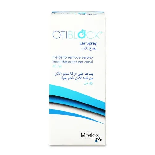 Otiblock Ear Spray is used to prevent and treat earwax buildup that can cause discomfort, itching, temporary hearing loss, or ear fullness.