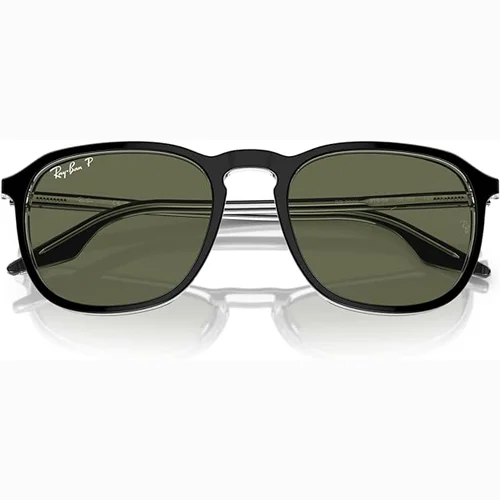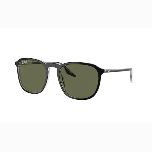 The sunglasses feature a black and clear square frame with a distinctive keyhole nose bridge and green polarized lenses.